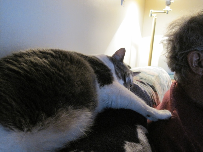 George shows how to be mellow about everything. This despite a day of being locked in his cat carrier after running through the wet paint on the basement stairs that I was working on...... he is shown here on the back of the sofa with his paw on Bog's shoulder while we watch a movie.